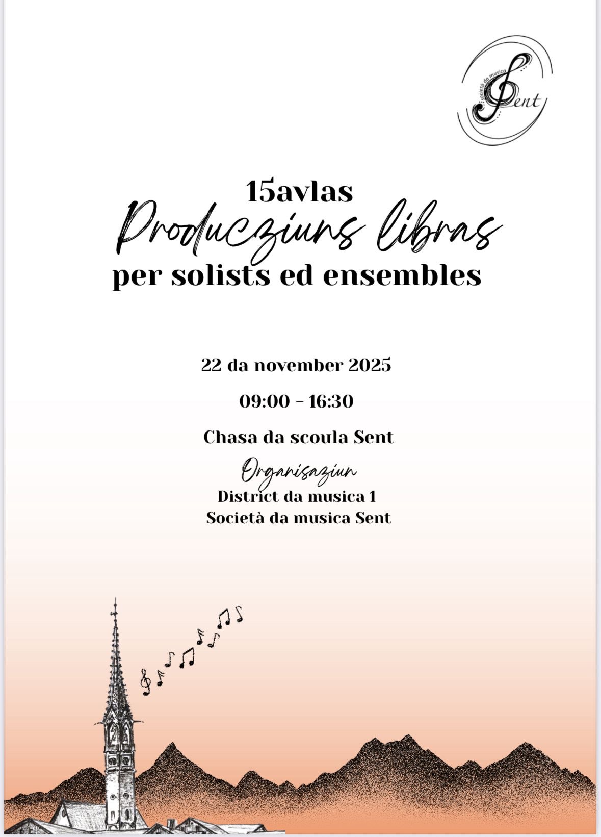 15avlas Producziuns libras per solists ed ensembles 22 da november 2025 09:00 - 16:30 Chasa da scoula Sent Organisaziun District da musica 1 Società da musica Sent