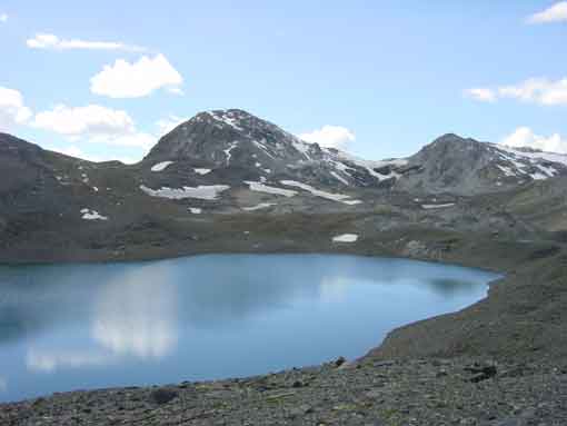 Am nördlichen Rand des heute nicht mehr vorhandenen Gletschers "Vadret d'Immez" liegt dieser recht grosse See, auf 2834 m ü. M. Hinten die zwei Dreitausender Piz Cotschen (3046 m) und Piz da l'Aua (3002 m), beides Grenzberge Sent / Scuol.