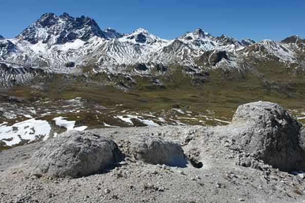 Pass dals Gips: Rauhgips zwischen Piz Chalchogns und Piz Davo Sassè mit interessanten Formationen. Im Hintergrund: das Fluchthorn aus kristallinem Gestein der Silvretta-Decke. |